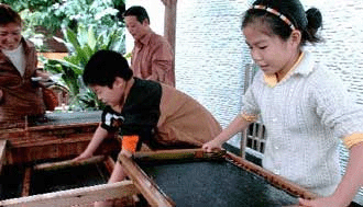10月27日,两位小朋友在按照“蔡伦造纸法”的方法制作纸张。近日,一座雕版印刷博物馆在江苏扬州开馆。该馆建筑面积约5000平方米,珍藏着近30万册、版的古代版片和古籍版本图书资料。