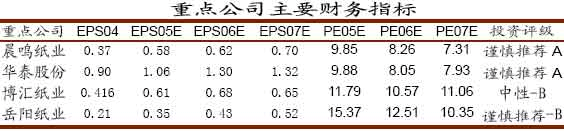 维持对晨鸣纸业、华泰股份“谨慎推荐”的评级。基于岳阳纸业丰富的林地资源优势,上调该公司评级至“谨慎推荐”。