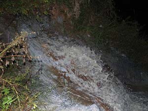 9月25日晚,跟随当地一位村民来到后湾造纸厂。夜色中,两扇紧锁着的铁皮门内灯火通亮,机器声轰鸣。这位村民说,造纸厂正在连夜生产。随后在该厂背后的一片杂草丛中发现,一个十分隐蔽的排污管道正在喷溅着浑浊的污水和泡沫,河滩已经被染成了铁锈样的颜色,黏腻的泡沫沾满了周围的野草和石头。